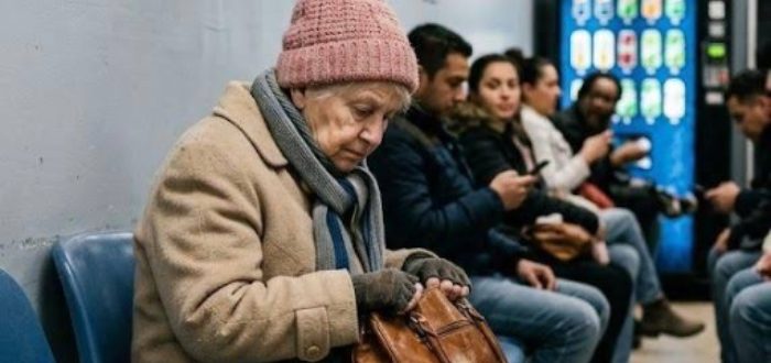 En äldre kvinna satt längst ut på en kall plastbänk och höll hårt i en gammal brun väska. Hennes kappa var alldeles för tunn för vädret, hennes halsduk