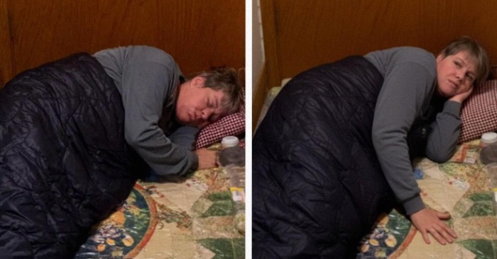 Och sedan såg jag det. Bakom henne, knappt synlig i bilden, låg en tunn campingmatta med en enda, sliten filt. Det såg ut som en billig matta. Ingen kudde. Ingen avskildhet. Bara en provisorisk säng mellan ett kvastskåp och en badrumsdörr.