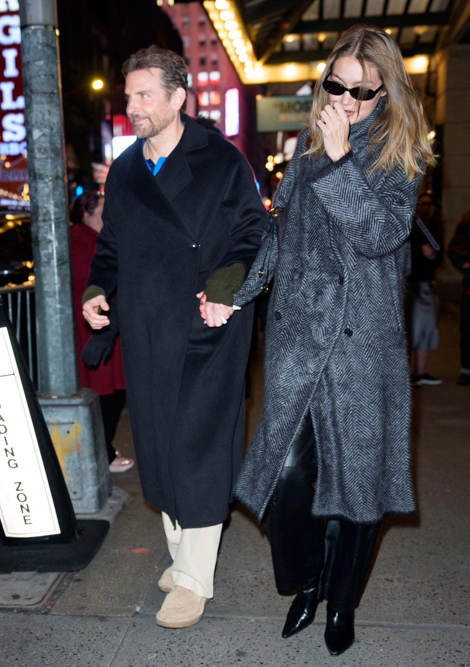För kvällen valde Hadid en raffinerad och återhållsam look. Hon bar en avslappnad, dubbelknäppt grå kappa som gick nedanför knäna, i kombination med svarta läderbyxor, spetsiga lackstövlar och mörka solglasögon. Outfiten kändes minimalistisk, självsäker och medvetet diskret.