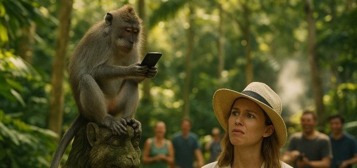 Hettan var så stark att luften darrade. Turister vandrade långsamt på stigarna, tog bilder, köpte kokosnötter. Emma höll sin telefon och försökte få signal — någonstans mellan palmerna