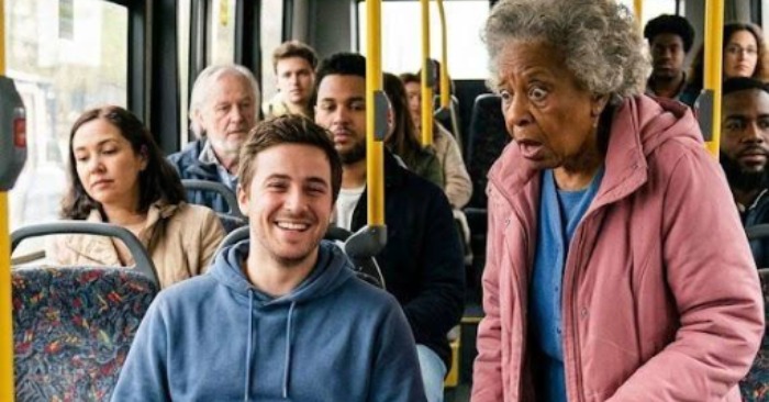 En äldre kvinna med en käpp klev ombord på bussen vid en hållplats. Hon rörde sig mycket försiktigt, som om varje steg var svårt för henne. Folk gjorde plats, men det fanns nästan inga lediga platser kvar. Och plötsligt lade hon märke till en – alldeles bredvid en ung man.