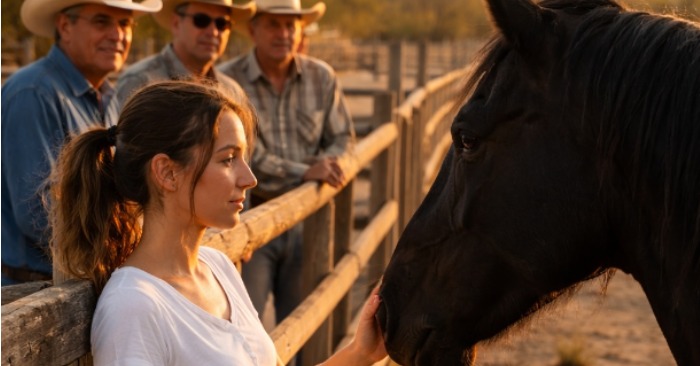 När hon närmade sig inhägnaden började folkmassan mumla. Folk väntade sig ett spektakel. Hästen var redan på kanten – spänd, arg, redo att bryta sig loss. Den verkade känna att de ville bryta den igen.