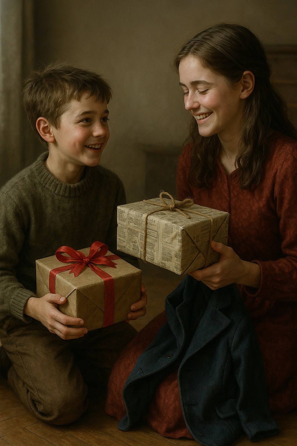 De satt vid elden, var och en med sin present i handen, medvetna om att de hade gett mer än bara en kappa eller stövlar. De hade gett uppoffringar, kärlek och bevis på att även i det minsta huset på Maple Street fanns de största skatterna inte under granen, utan i hjärtat hos två barn som brydde sig mer om varandra än om sig själva.