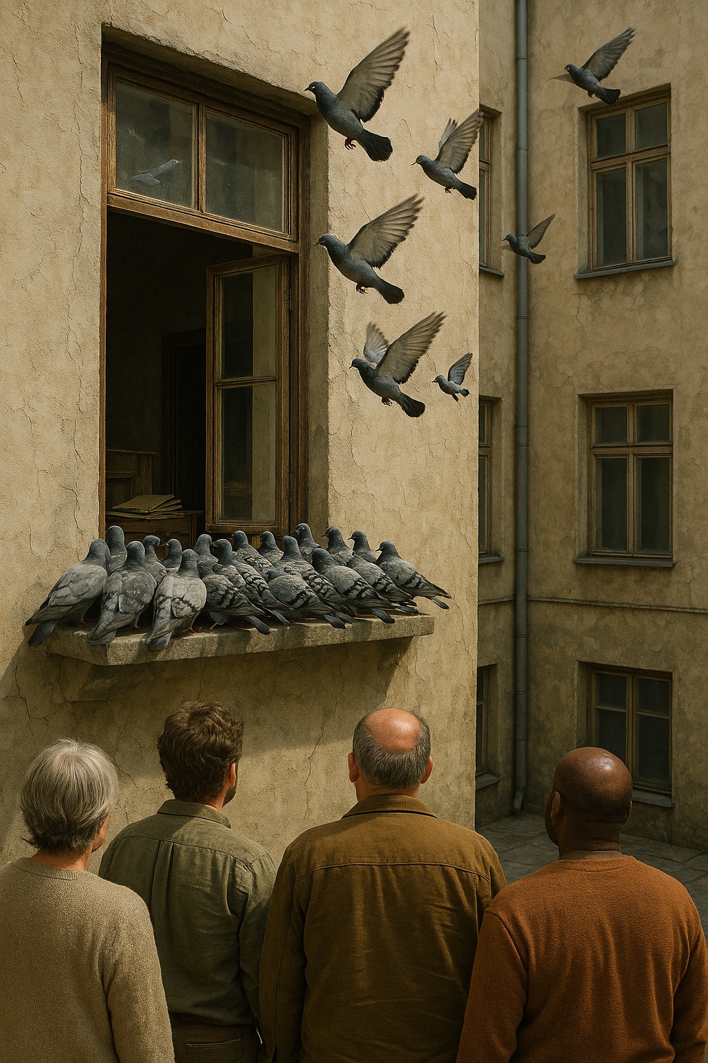Vissa boende började spekulera. Vissa hävdade att en gammal kvinna bodde där och matade fåglarna med bröd. Andra viskade att ingen hade setts i lägenheten på länge och att något annat lockade duvorna. Stämningen i trapphuset blev alltmer spänd: fåglarna cirklade och flaxade med vingarna så högt att man kunde höra dem även på natten.