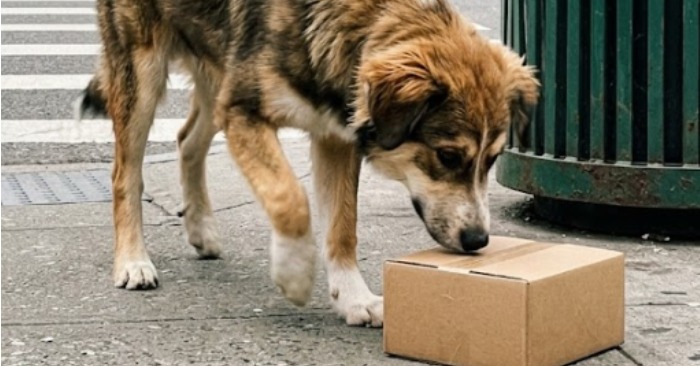 Han stannade inte ett ögonblick. Tryckt mot en fyrkantig kartong som stod bredvid en metallbehållare vid kanten av trottoaren, drog han i de fuktiga hörnen med tänderna, slog på sidorna med tassarna, sprang nervöst i cirklar – bara för att omedelbart attackera igen, som om hela hans varelse var fokuserad på en enda brådskande uppgift: att öppna den.