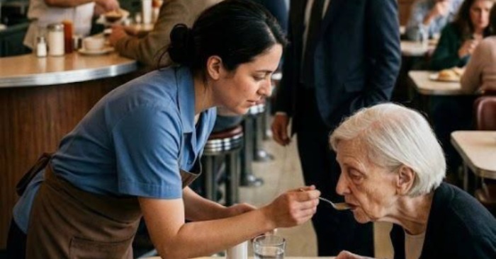 En äldre kvinna satt vid ett hörnbord, hennes vita hår omsorgsfullt stylat, hennes hållning fortfarande präglad av en stilla värdighet som inte ens sjukdom hade kunnat ta ifrån henne, men tallriken framför henne förblev orörd, medan hennes hand darrade okontrollerat, gaffeln bara halvvägs lyft, bara för att fallera gång på gång i en långsam, smärtsam kamp som ingen annan tycktes lägga märke till.