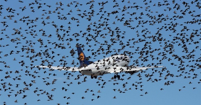 Sedan kontaktade kabinpersonalen honom med alarmerande nyheter. Utanför flygplanet hade en enorm flock fåglar börjat cirkla runt det.