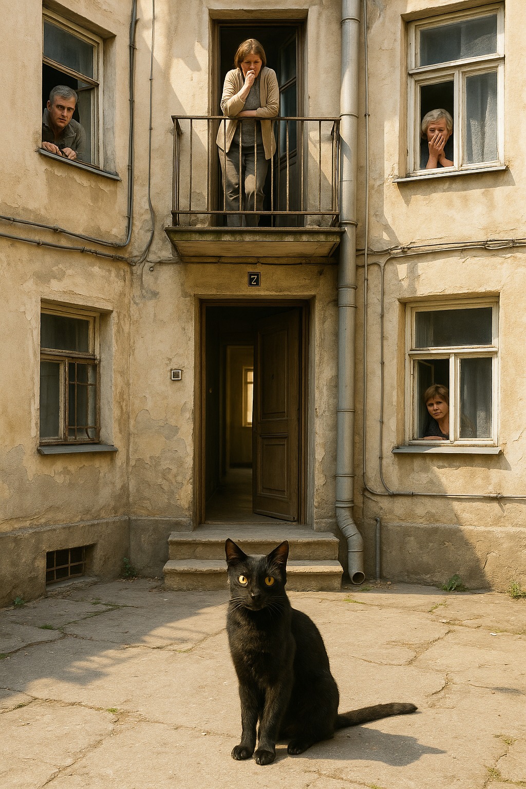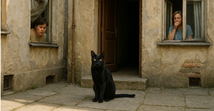 Kvinnan steg ut på trappavsatsen och stelnade till när hon såg den svarta katten vid sina fötter. Grannarna, som kikade ut genom sina dörrar, utbytte blickar, rädda för att säga ett ord. Katten lyfte huvudet och stirrade på henne med sina gula ögon.