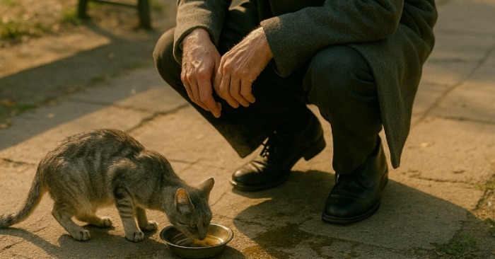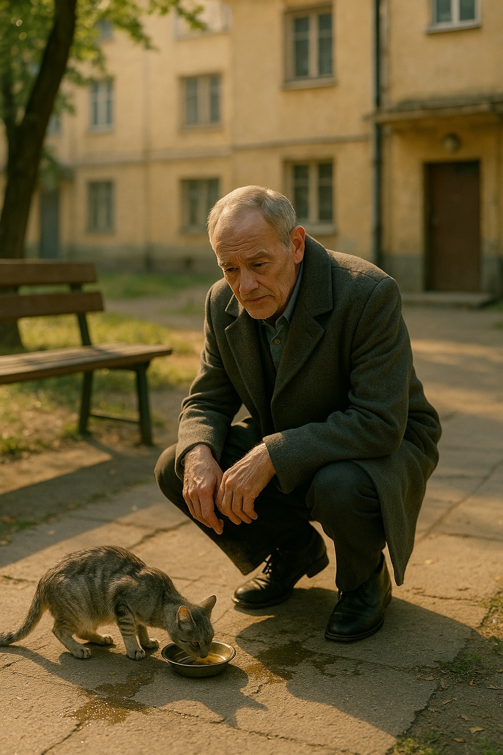 Först gick han bara förbi. Men en dag kunde han inte låta bli — han köpte mjölk och lite fisk och lämnade det på trottoaren.
