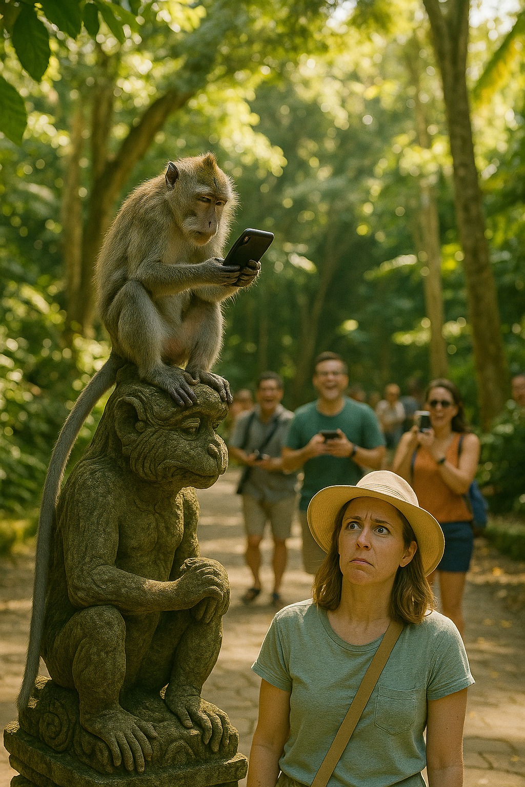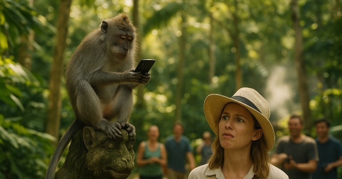 Allt hände på en sekund. Apen hoppade, grep telefonen och klättrade upp på Buddha-statyn. Emma skrek, killen skrattade. Turisterna tog fram sina kameror — showet började.