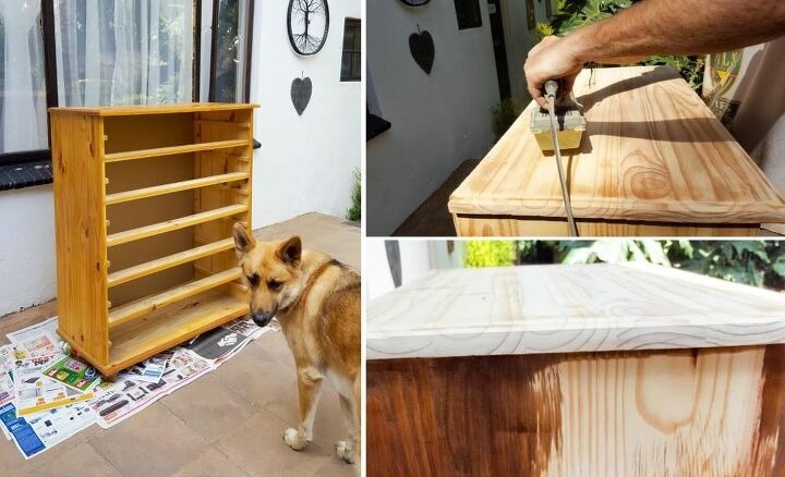 Vi tog bort alla lådor, gjorde oss av med de gamla trähandtagen och slipade försiktigt ytan. Sedan målade vi den med en varm, fyllig träbets – byrån såg omedelbart mer raffinerad ut.
