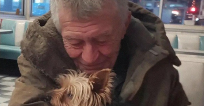 En gammal man stod i dörröppningen. Han var smal, hans kappa var för stor för honom, ena byxbenet var uppstoppat. Han lutade sig mot en käpp. En väldigt liten hund gick fram och tillbaka bredvid honom – det såg ut som om den hade pusslats ihop av olika gosedjur.