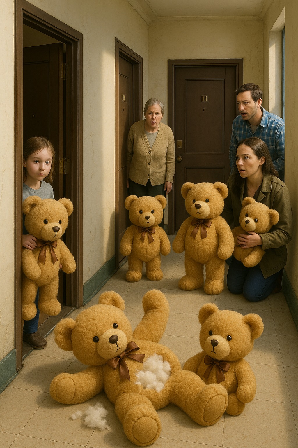Livet i den gamla byggnaden fortsatte som vanligt: hissen fastnade, lamporna i trapphuset flimrade, grannarna grälade om sopor och reparationer. Ingen blev längre förvånad över någonting. Men en morgon började nallebjörnar dyka upp vid lägenheternas dörrar. De var små, mjuka och hade rosetter runt halsen och såg ut som en oskyldig present.