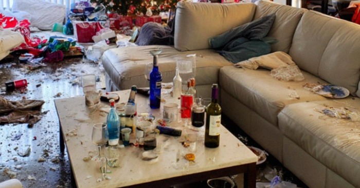 Överfulla soptunnor. Tomflaskor på bänkskivan. Klibbiga glasmärken. Röda plastmuggar på golvet.