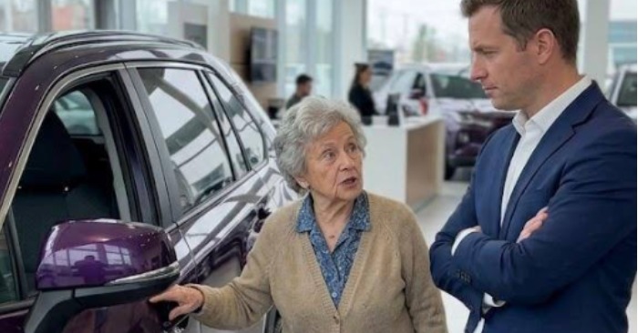 ”Jag vill köpa den här bilen”, sa den gamla kvinnan – men säljaren hånade henne och kastade ut henne eftersom hon påstås lukta fattigdom… Det som hände sedan fick hela utställningslokalen att frysa till is.