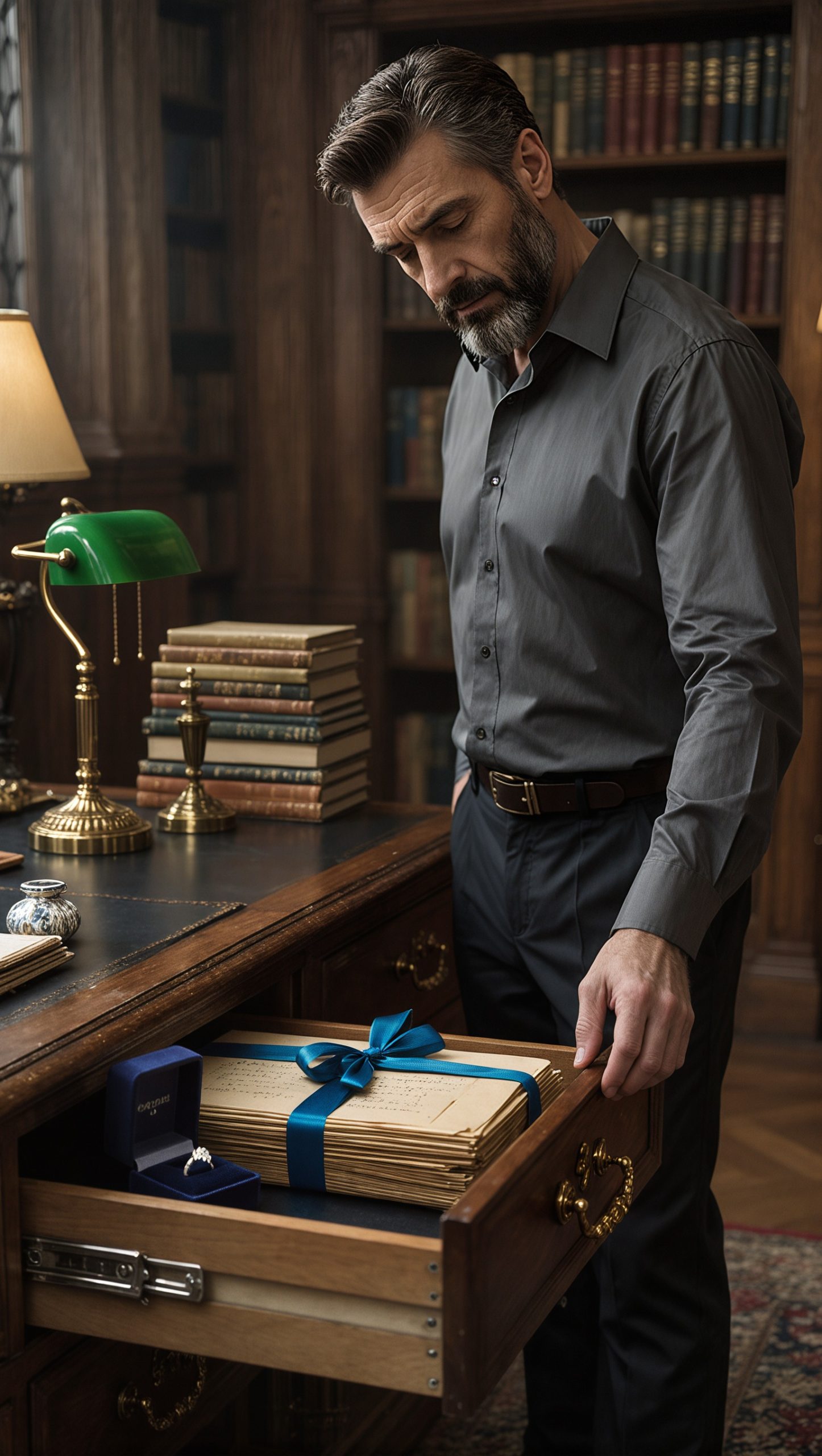 Inuti låg en stapel brev bundna med ett blekt band. Papperet var sprött, bläcket utsmetat. Men det som fångade hans blick var inte breven. Det var kuvertet längst ner – tjockare, tyngre. Inuti låg en diamantring, vars sten var matt av ålder men otvetydigt värdefull.