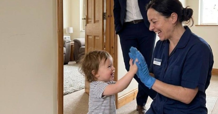 Pojken sprang till sin pappa. Barnflickan reste sig upp och sänkte blicken.