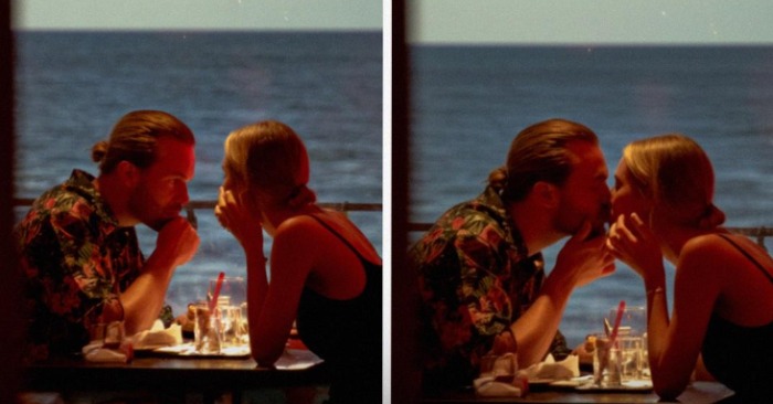 En lyxhotellpool. Två vinglas. En mans hand på en kvinnas lår. Och ett flätat läderarmband på hennes handled.