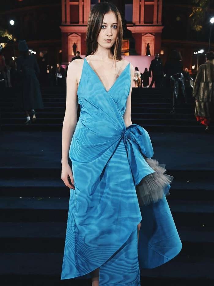 För den röda mattan valde söndagen en blå klänning med en ovanlig asymmetrisk siluett. Lätt draperi och en djup V-ringning gav outfiten en luftig känsla. Accentelementet var en stor dekorativ rosett på sidan. Flickan lämnade håret löst.
