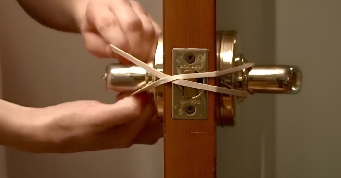 Så här fungerar det: när dörren öppnas lätt och låskolven är urkopplad håller gummibandet spärren på ett sätt som hindrar den från att låsas igen. Husägaren kanske inte ens märker vad som händer – men det ger någon utanför en möjlighet att slinka in snabbt medan dörren inte kan säkras.