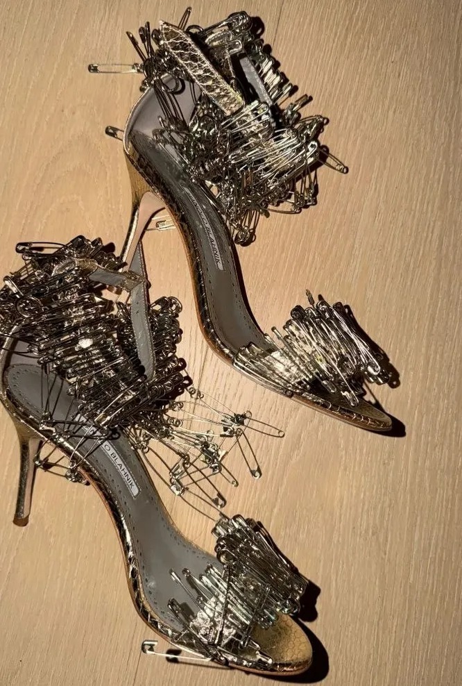 Manolo Blahnik-sandaler kompletterade outfiten – designern lade till liknande metalliska accenter. Looken var sammanhängande och djärv.