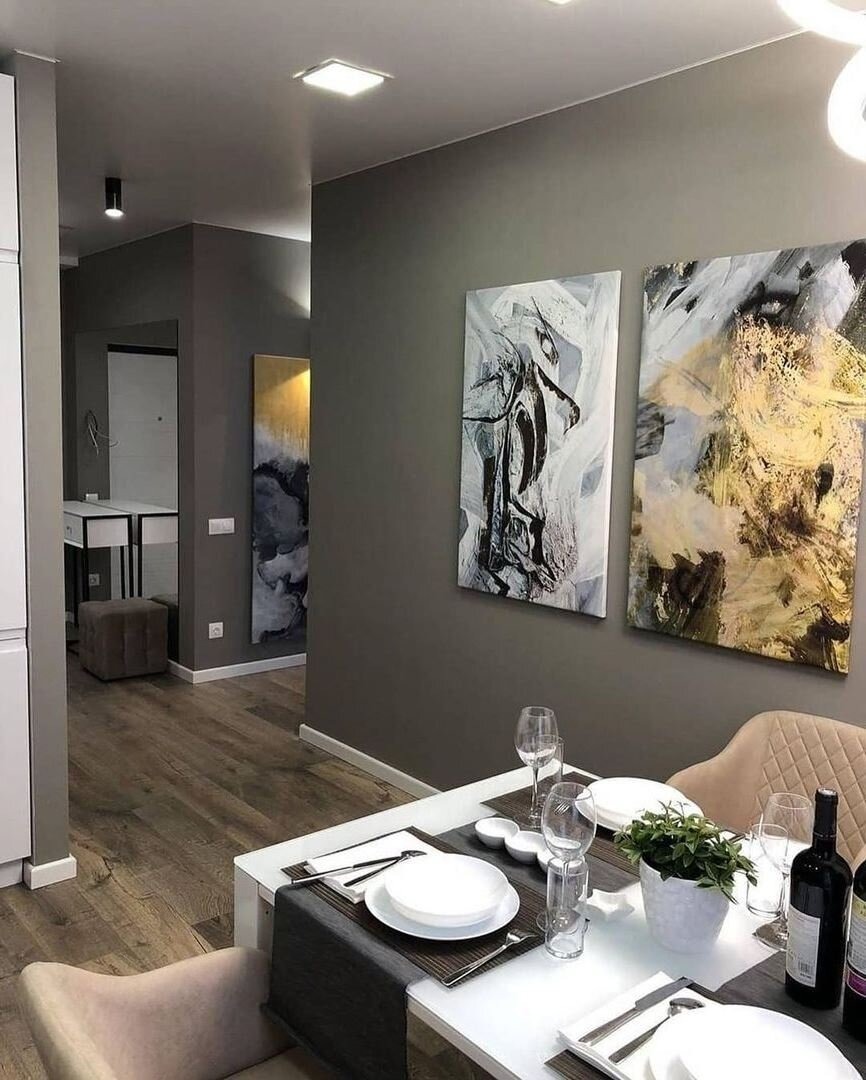 Vi bestämde oss för att förstärka atmosfären med stora abstrakta målningar – svarta penseldrag med guldaccenter ser otroligt slående ut. Golvet är täckt med kallt grått laminat, vilket perfekt kompletterar det övergripande färgschemat. Vi höll dörrarna mellan rummen klassiskt vita och tog bort dörren i köket, vilket skapade en tydlig passage.