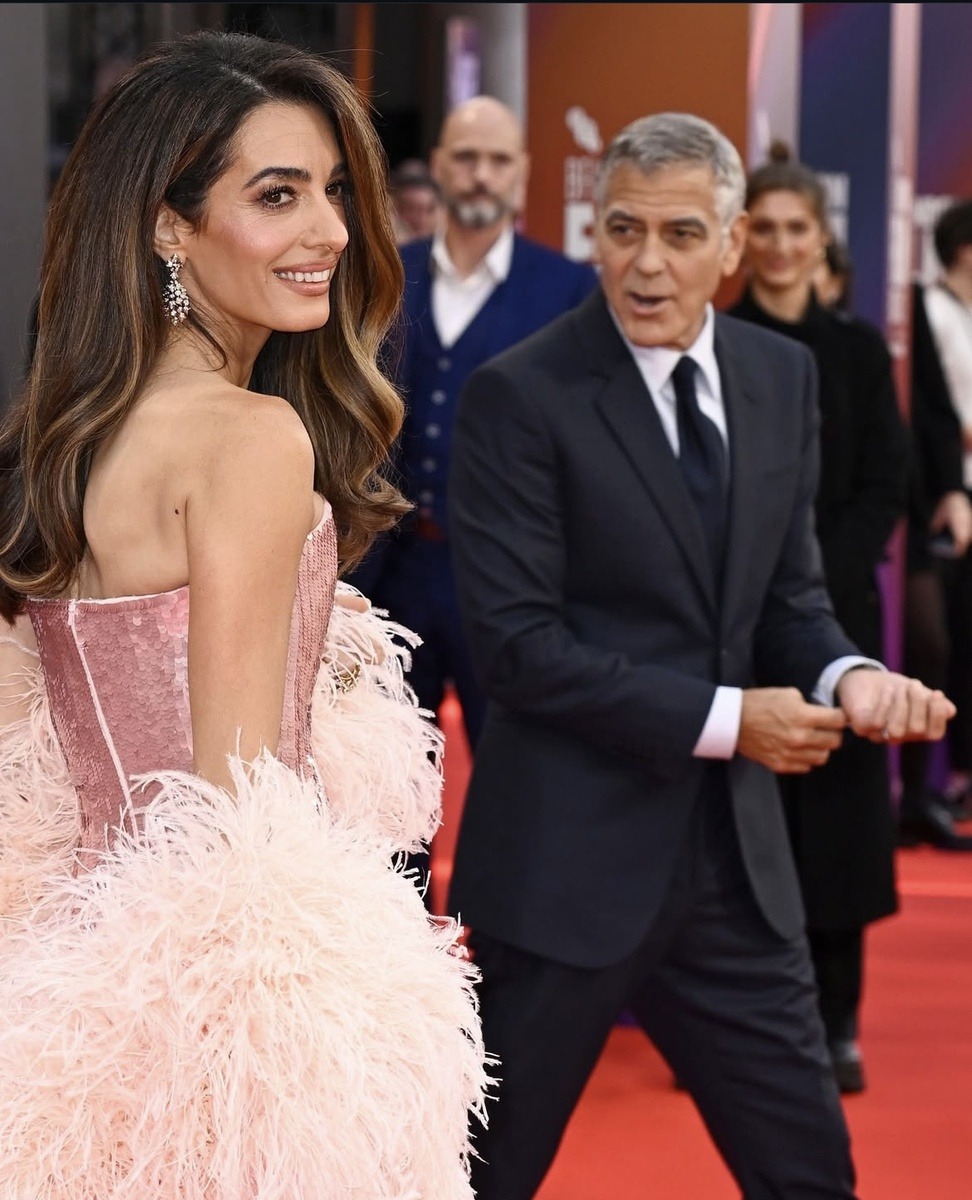 Amal Clooney dök upp i en lyxig skimrande rosa Tamara Ralph-klänning med en böljande fjäderkappa – och stal omedelbart showen.